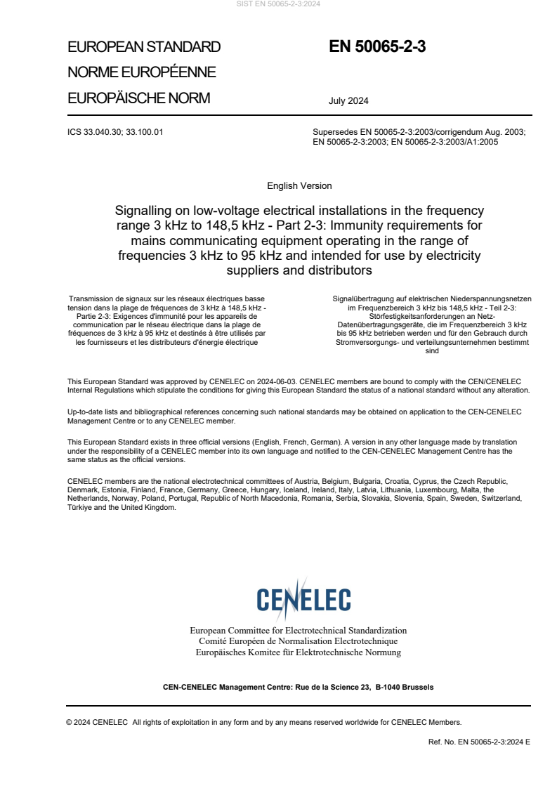 EN 50065-2-3:2024 is a standard published by CLC. Its full title is "Signalling on low-voltage electrical installations in the frequency range 3 kHz to 148,5 kHz - Part 2-3: Immunity requirements for mains communicating equipment operating in the range of frequencies 3 kHz to 95 kHz and intended for use by electricity suppliers and distributors". This standard covers: This document applies to electrical equipment using signals in the frequency range 3 kHz to 95 kHz to transmit or receive information on low voltage electrical systems, for electricity suppliers and distributors. Mains communicating equipment (MCE) may fall into one of the two following categories: - MCE implementing transmission or reception of information on LV distribution networks or installations of network users connected to the public electricity distribution network as the sole function. Immunity requirements for such equipment are entirely covered by this document; - MCE being equipment covered by the scope of other standards, integrating mains communication as one of their functions. In this case, only the immunity requirements for the mains communication function of such equipment are covered by the scope of this document. Immunity requirements for all other available functions of this equipment are covered by the relevant product standard or generic standard. The object of this document is to contribute to ensuring EMC in general. It specifies essential immunity requirements and test methods, including those tests which are to be performed during type-testing of MCE, for electromagnetic interference (EMI) generated on LV installations. It defines the methods and requirements for testing immunity of MCE on meeting the essential requirements of the EMCD. Test requirements are specified for each port considered. Furthermore, it provides guidelines for the assessment of the performance of the communication function of an MCE. Normative specifications are under consideration. This document gives immunity requirements which are applicable to MCE used by electricity suppliers and distributors (e.g. DSOs) for purposes like energy management and network monitoring and automation. The levels do not however cover extreme cases which could occur in any location but with a low probability of occurrence. In special cases situations will arise where the level of disturbances could exceed the levels specified in this document, e.g. where a hand-held transmitter is used in proximity of an apparatus. In these instances special mitigation measures might have to be employed. It does not specify immunity of MCE to signals from other MCE operating in the same nominal frequency band or immunity to signals originating from power line carrier systems operating on high or medium-voltage networks. Safety considerations are not included in this document.