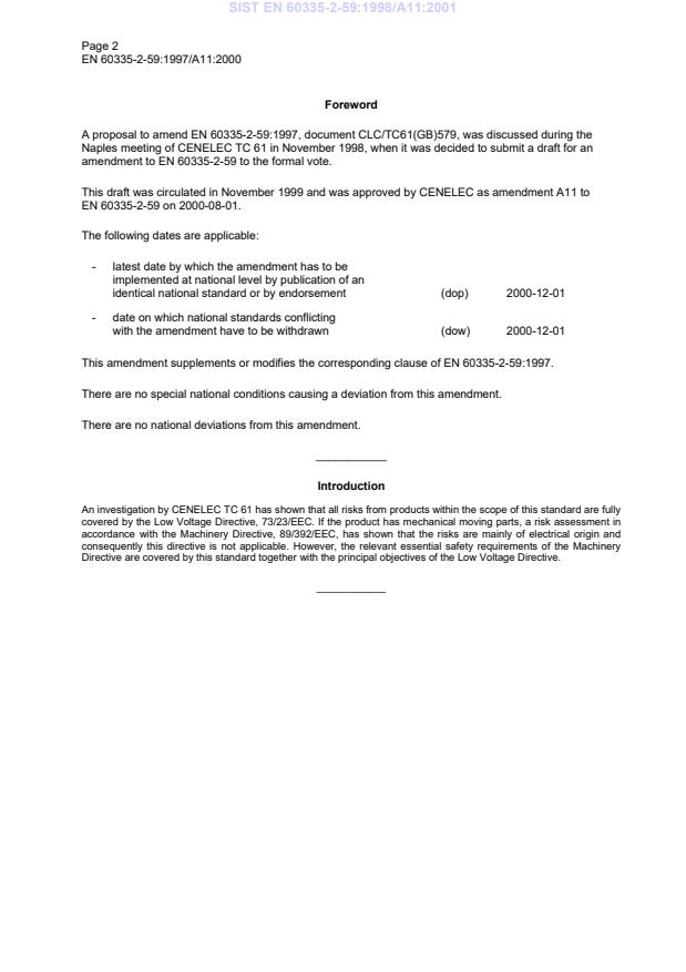 This amendment A11 modifies the European Standard EN 60335-2-59:1997; it was approved by
