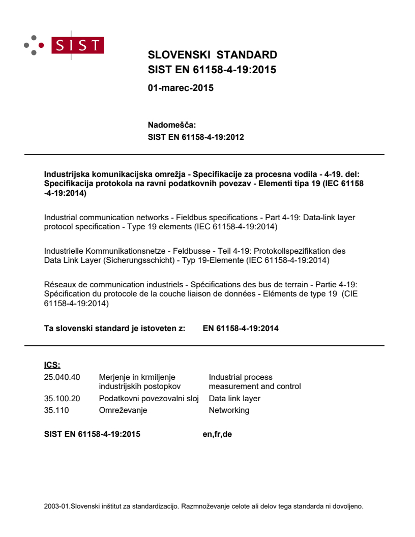 Ta slovenski standard je istoveten z: EN 61158-4-19:2014