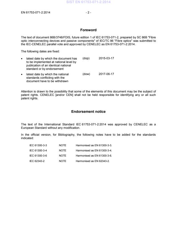 Attention is drawn to the possibility that some of the elements of this document may be the subject of patent rights. CENELEC [and/or CEN] shall not be held responsible for identifying any or all such patent rights. Endorsement notice The text of the International Standard IEC 61753-071-2:2014 was approved by CENELEC as a European Standard without any modification. In the official version, for Bibliography, the following notes have to be added for the standards indicated: IEC 61300-3-3 NOTE Harmonised as EN 61300-3-3. IEC 61300-3-4 NOTE Harmonised as EN 61300-3-4. IEC 61300-3-6 NOTE Harmonised as EN 61300-3-6. IEC 62343-2 NOTE Harmonised as EN 62343-2. SIST EN 61753-071-2:2014