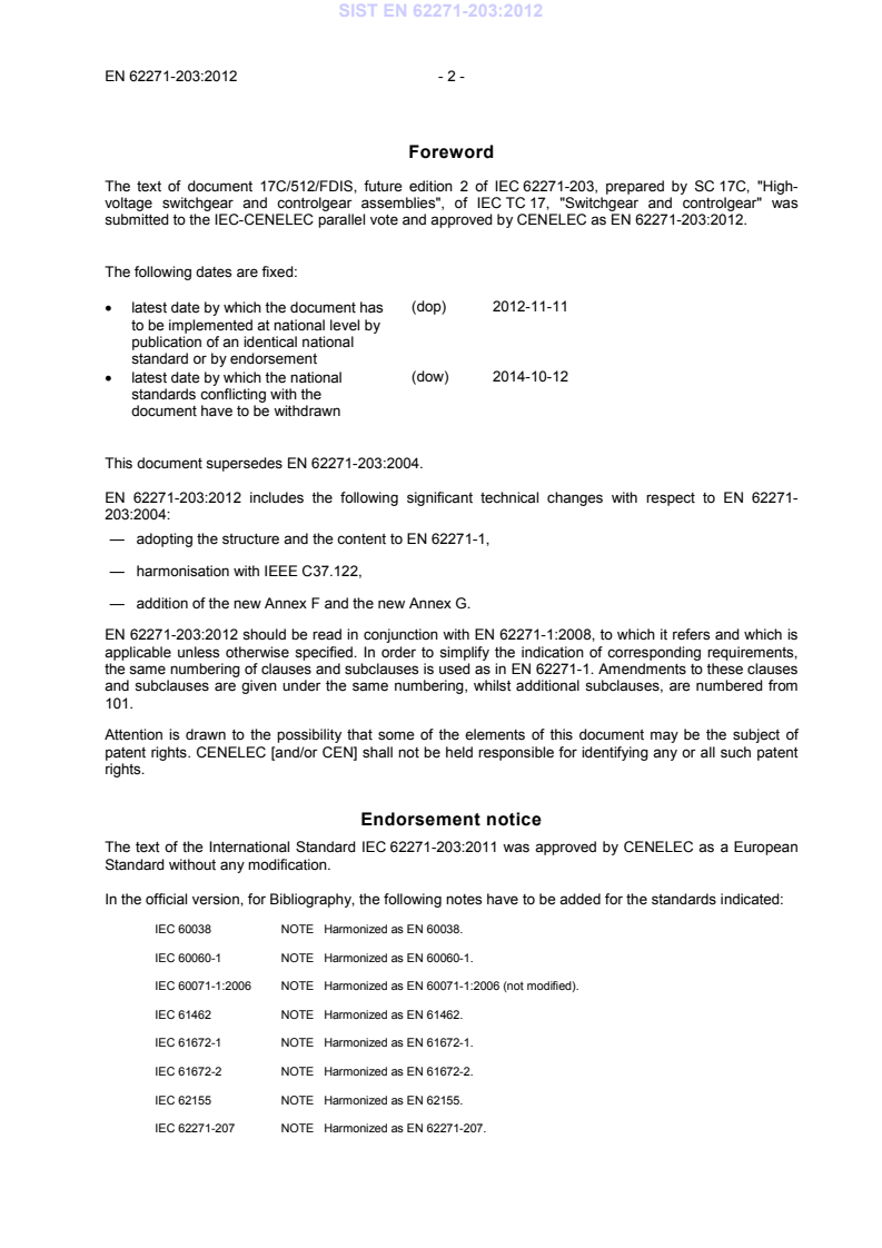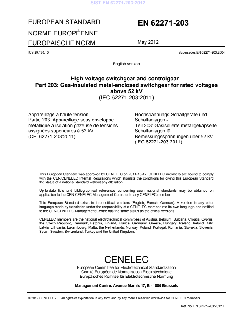 EN 62271-203:2012 is a standard published by CLC. Its full title is "High-voltage switchgear and controlgear - Part 203: Gas-insulated metal-enclosed switchgear for rated voltages above 52 kV". This standard covers: IEC 62271-203:2011 specifies requirements for gas-insulated metal-enclosed switchgear in which the insulation is obtained, at least partly, by an insulating gas other than air at atmospheric pressure, for alternating current of rated voltages above 52 kV, for indoor and outdoor installation, and for service frequencies up to and including 60 Hz. This second edition of IEC 62271-203 cancels and replaces the first edition of IEC 62271-203, published in 2003, and constitutes a technical revision. This edition includes the following significant technical changes with respect to the previous edition: - adopting the structure and the content to IEC 62271-1, - harmonisation with IEEE C37.122, - addition of the new Annex F and the new Annex G. This publication is to be read in conjunction with IEC 62271-1:2007.