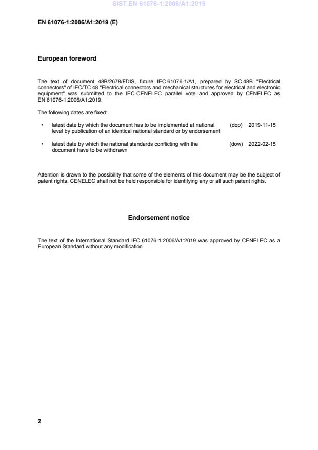 This amendment A1 modifies the European Standard EN 61076-1:2006; it was approved by CENELEC on 2019-02-15. CENELEC