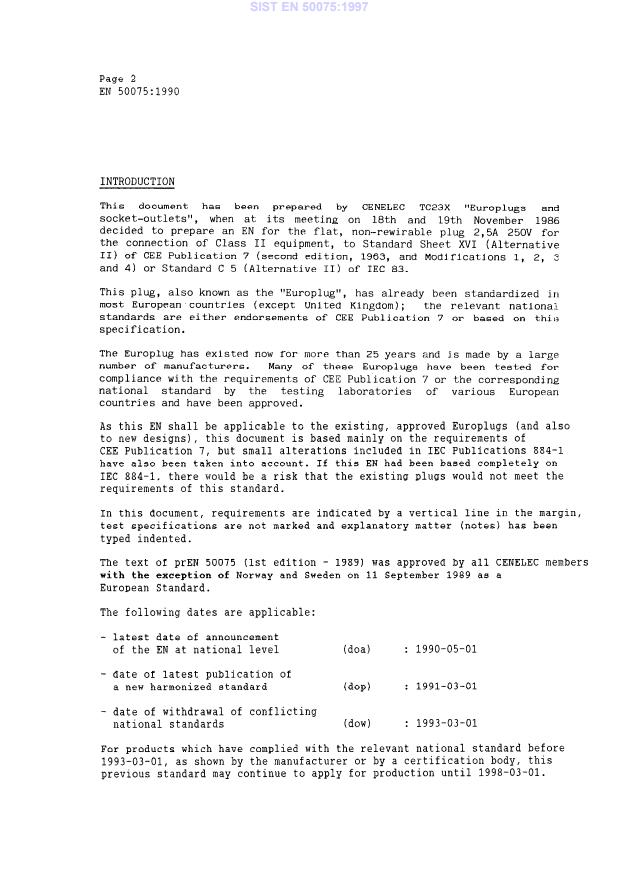 EN 50075:1990 is a standard published by CLC. Its full title is "Flat non-rewirable two-pole plugs, 2,5 A 250 V, with cord, for the connection of class II-equipment for household and similar purposes". This standard covers: This standard applies to flat non-rewirable two-pole plugs without earthing contact with a rated voltage of 250 V a.c. and a rated current of 2,5 A. They are supplied with a cord, for the purposes, and having no special protection against ingress or water are intended for indoor use. Plugs complying with this standard are suitable for use at ambient temperatures not normally exceeding 25°C but occasionally reaching 35°C. Plug portions of adapters or equipment, such as razors or lamps with rechargeable batteries, plug-in transformers, etc., shall comply with the requirements of this standard as far as they reasonably apply.