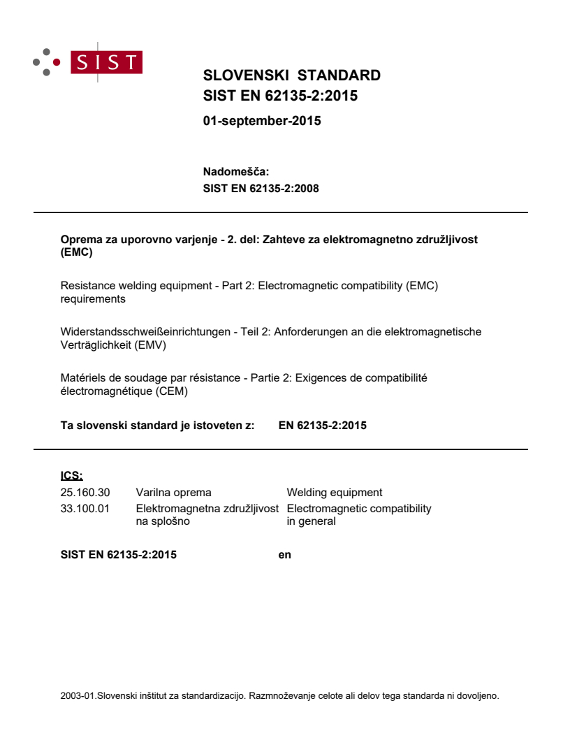 EN 62135-2:2015 is a standard published by CLC. Its full title is "Resistance welding equipment - Part 2: Electromagnetic compatibility (EMC) requirements". This standard covers: IEC 62135-2:2015 is applicable to equipment for resistance welding and allied processes which are connected to mains supplies with rated voltages up to 1 000 V a.c. r.m.s. This standard does not define safety requirements. This second edition cancels and replaces the first edition published in 2007 and constitutes a technical revision. This edition includes the following significant technical changes with respect to the previous edition: - update of the applicable limits related to the updated reference to CISPR 11; - exclusion of the use of narrow band relaxations for RF emission limits; - update of the applicable limits for harmonics and flicker related to the updated reference to IEC 61000-3-11 and IEC 61000-3-12; - update of the requirements for voltage dips related to the updated reference to IEC 61000-4-11 and IEC 61000-4-34; - inclusion of symbols to indicate the RF equipment class and restrictions for use; - inclusion of EM field immunity test for frequency from 1,4 GHz to 2,7 GHz; - inclusion of emission limits for class B resistance welding equipment magnetic fields between 150 kHz and 30 MHz.