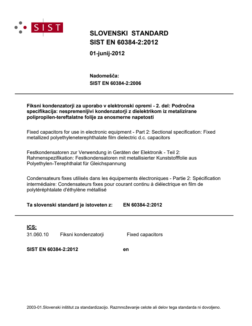 31.060.10 Fiksni kondenzatorji Fixed capacitors