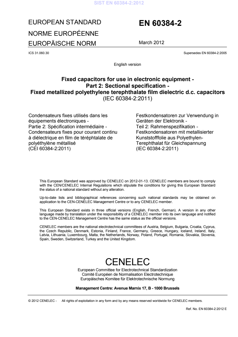 EN 60384-2:2012 is a standard published by CLC. Its full title is "Fixed capacitors for use in electronic equipment - Part 2: Sectional specification - Fixed metallized polyethylene terephthalate film dielectric d.c. capacitors". This standard covers: IEC 60384-2:2011 applies to fixed capacitors for direct current, with metallized electrodes and polyethylene-terephthalate dielectric for use in electronic equipment. These capacitors may have 'self-healing properties' depending on conditions of use. They are primarily intended for applications where the a.c. component is small with respect to the rated voltage. Two performance grades of capacitors are covered, Grade 1 for long-life application and Grade 2 for general application. Capacitors for electromagnetic interference suppression and surface mount fixed metallized polyethylene-terephthalate film dielectric d.c. capacitors are not included, but are covered by IEC 60384-14 and IEC 60384-19 respectively. This fourth edition cancels and replaces the third edition published in 2005 and contains the following significant technical changes with respect to the previous edition. - Table 1, Sampling plan together with numbers of permissible non-conformance for qualification approval test, has been adjusted. - Table 3, Lot-by-lot inspection, has been changed, highlighting assessment level EZ only. - Table 4, Periodic inspection, has been changed, highlighting assessment level EZ only. - The preferred values of rated voltages have been updated in conformance with the basic series of preferred values R5 and R10 given in ISO 3.