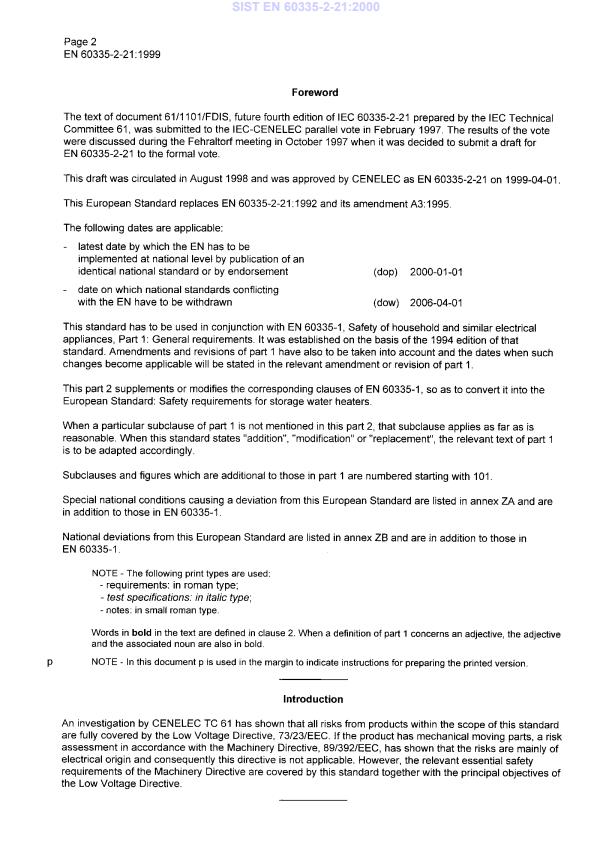 EN 60335-2-21:1999 is associated with the following European legislation: EU Directives/Regulations: 2006/95/EC, 73/23/EEC. When a standard is cited in the Official Journal of the European Union, products manufactured in conformity with it benefit from a presumption of conformity with the essential requirements of the corresponding EU directive or regulation.