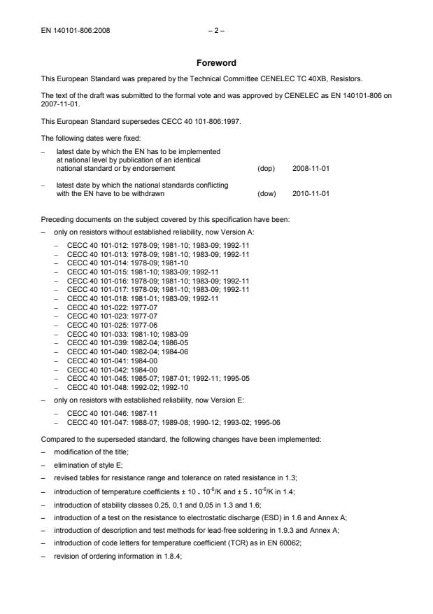 2010-11-01 Preceding documents on the subject covered by this specification have been: – only on resistors without established reliability, now Version A: − CECC 40 101-012: 1978-09; 1981-10; 1983-09; 1992-11 − CECC 40 101-013: 1978-09; 1981-10; 1983-09; 1992-11 − CECC 40 101-014: 1978-09; 1981-10 − CECC 40 101-015: 1981-10; 1983-09; 1992-11 − CECC 40 101-016: 1978-09; 1981-10; 1983-09; 1992-11 − CECC 40 101-017: 1978-09; 1981-10; 1983-09; 1992-11 − CECC 40 101-018: 1981-01; 1983-09; 1992-11 − CECC 40 101-022: 1977-07 − CECC 40 101-023: 1977-07 − CECC 40 101-025: 1977-06 − CECC 40 101-033: 1981-10; 1983-09 − CECC 40 101-039: 1982-04; 1986-05 − CECC 40 101-040: 1982-04; 1984-06 − CECC 40 101-041: 1984-00 − CECC 40 101-042: 1984-00 − CECC 40 101-045: 1985-07; 1987-01; 1992-11; 1995-05 − CECC 40 101-048: 1992-02; 1992-10 – only on resistors with established reliability, now Version E: − CECC 40 101-046: 1987-11 − CECC 40 101-047: 1988-07; 1989-08; 1990-12; 1993-02; 1995-06 Compared to the superseded standard, the following changes have been implemented: – modification of the title; – elimination of style E; – revised tables for resistance range and tolerance on rated resistance in 1.3; – introduction of temperature coefficients ± 10 . 10-6/K and ± 5 . 10-6/K in 1.4; – introduction of stability classes 0,25, 0,1 and 0,05 in 1.3 and 1.6; – introduction of a test on the resistance to electrostatic discharge (ESD) in 1.6 and Annex A; – introduction of description and test methods for lead-free soldering in 1.9.3 and Annex A; – introduction of code letters for temperature coefficient (TCR) as in EN 60062; – revision of ordering information in 1.8.4;