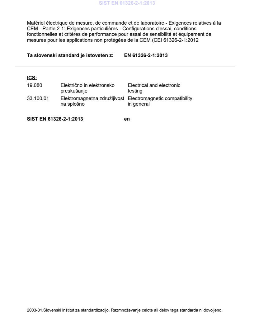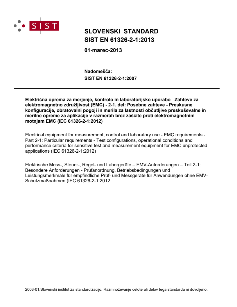 2003-01.Slovenski inštitut za standardizacijo. Razmnoževanje celote ali delov tega standarda ni dovoljeno.3UHVNXVQHRPDJQHWQLPElektrische Mess-, Steuer-, Regel- und Laborgeräte – EMV-Anforderungen – Teil 2-1: Besondere Anforderungen - Prüfanordnung, Betriebsbedingungen und Leistungsmerkmale für empfindliche Prüf- und Messgeräte für Anwendungen ohne EMV-Schutzmaßnahmen (IEC 61326-2-1:2012Electrical equipment for measurement, control and laboratory use - EMC requirements - Part 2-1: Particular requirements - Test configurations, operational conditions and performance criteria for sensitive test and measurement equipment for EMC unprotected applications (IEC 61326-2-1:2012)01-marec-2013SIST EN 61326-2-1:2013SLOVENSKI