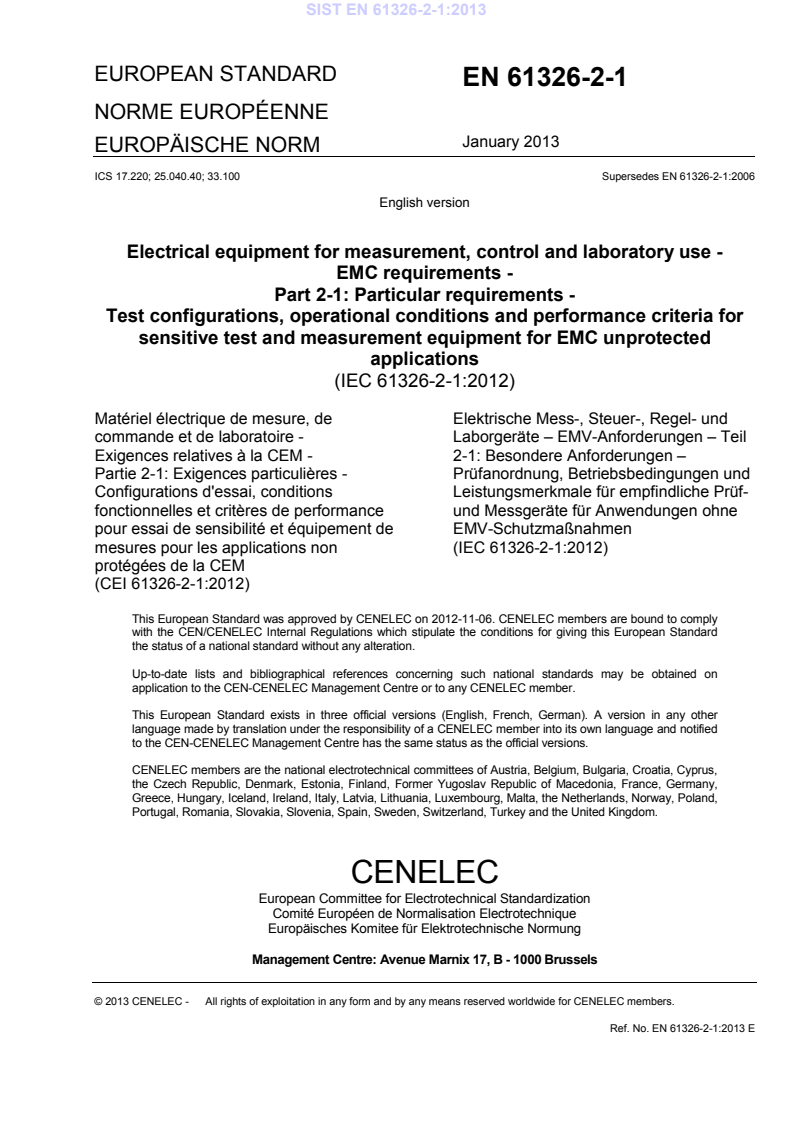 Endorsement notice The text of the International Standard IEC 61326-2-1:2012 was approved by CENELEC as a European Standard without any modification. SIST EN 61326-2-1:2013