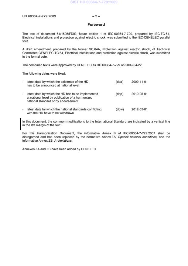 HD 60364-7-729:2009 (CLC) is the CENELEC harmonization document for part of IEC 60364 dealing with low‑voltage electrical installations in restricted access areas that contain switchgear and controlgear. Its scope covers basic protection, safety measures and specific requirements for operating or maintenance gangways (also called service or access gangways) used for operation, inspection, maintenance and emergency evacuation.