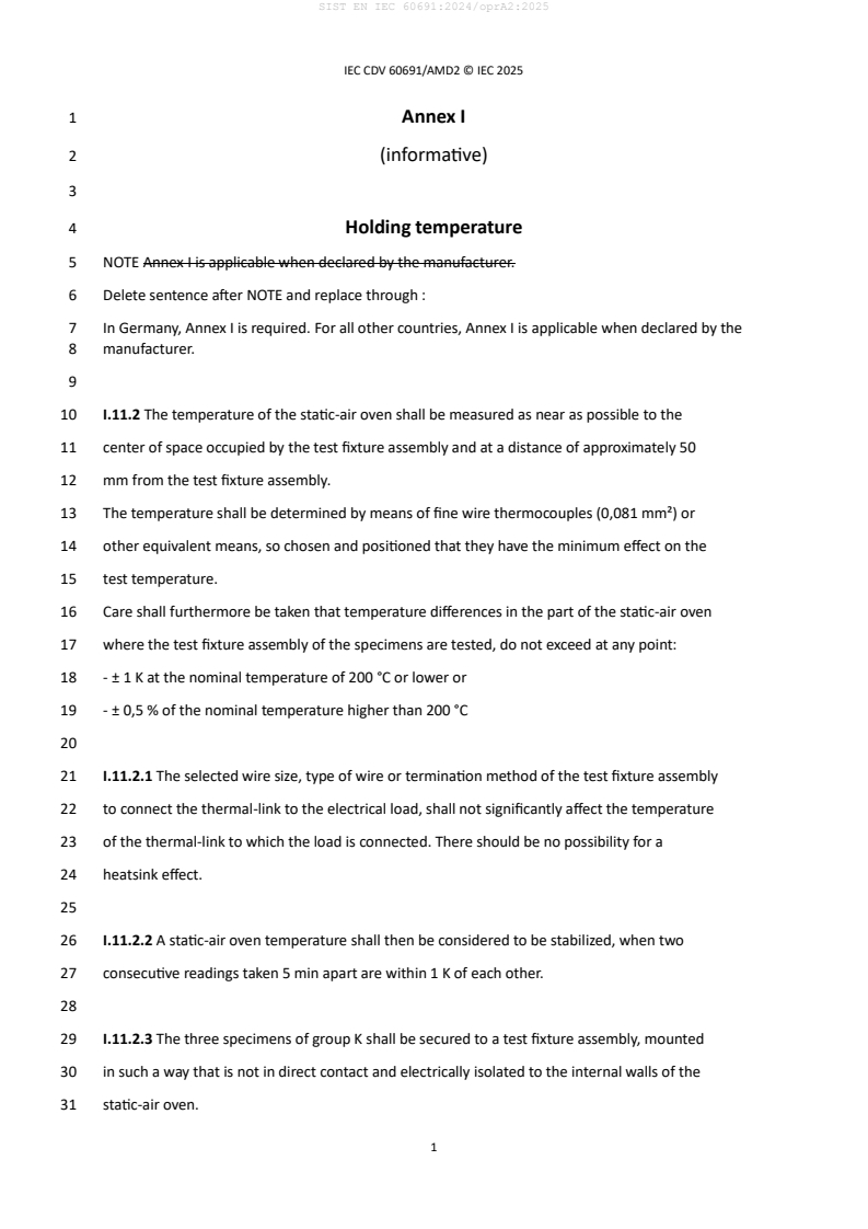 Keywords: EN IEC 60691 amendment 2, thermal-links, thermal protection devices, overcurrent protection, static-air oven testing, miniature fuses, IEC 60691:2023, thermal fuse standards, electrical safety components, fuse testing requirements.
