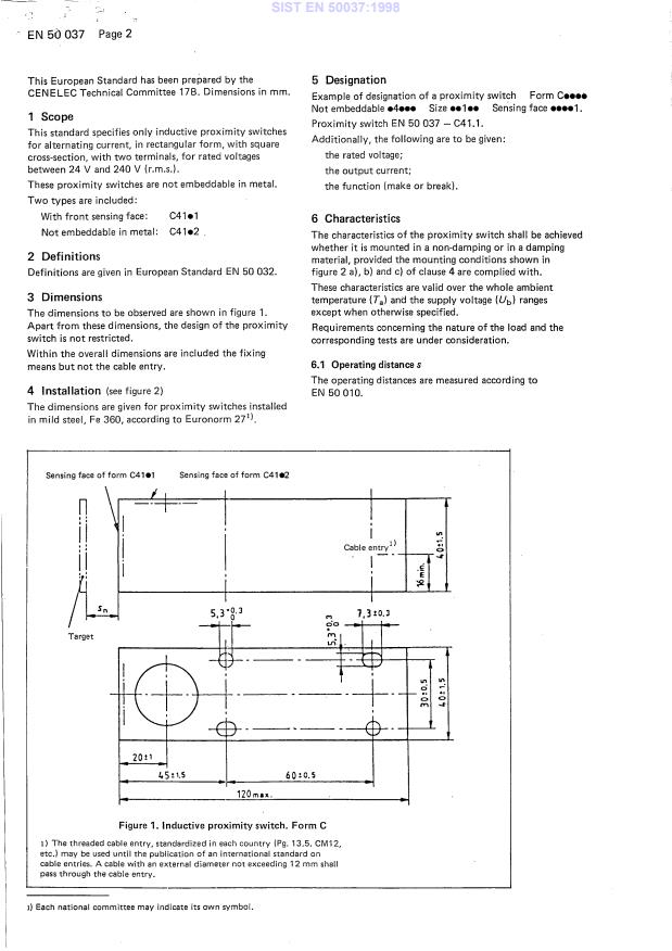 EN 50037:1988 is a standard published by CLC. Its full title is "Low-voltage switchgear and controlgear for industrial use - Inductive proximity switches - Form C, for alternating current, 2 terminals". This standard covers: D100/022: EN withdrawn