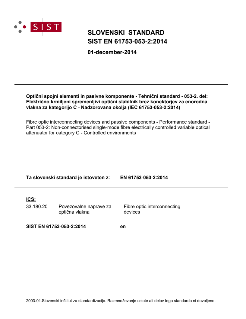 Optični spojni elementi in pasivne komponente - Tehnični standard - 053-2. del: Električno krmiljeni spremenljivi optični slabilnik brez konektorjev za enorodna vlakna za kategorijo C - Nadzorovana okolja (IEC 61753-053-2:2014)