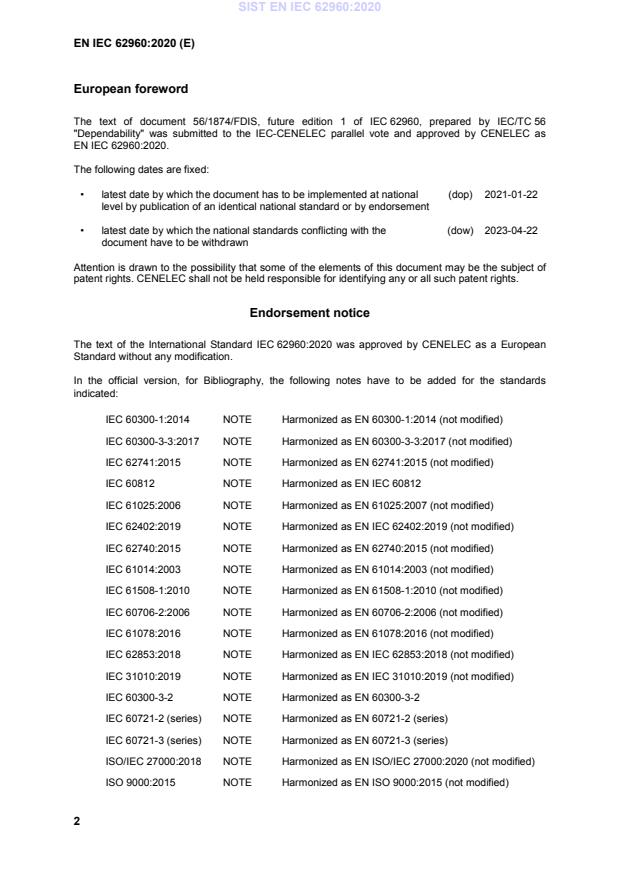 EN IEC 62960 references and aligns with other dependability and quality standards, for example: IEC 60300‑1, IEC 60300‑3‑3, IEC 62402, IEC 61508‑1, ISO/IEC 27000, ISO 9000 and relevant IEC/ISO reliability, risk and testing publications. These standards can be used together to build a comprehensive dependability program.