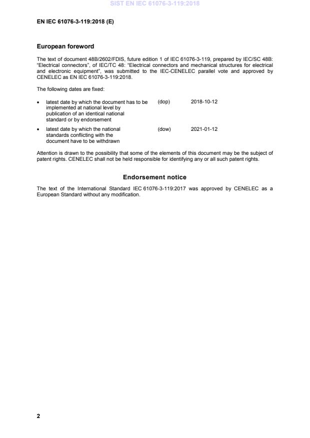 8) Attention is drawn to the Normative references cited in this publication. Use of the referenced publications is indispensable for the correct application of this publication. 9) Attention is drawn to the possibility that some of the elements of this IEC Publication may be the subject of patent rights. IEC shall not be held responsible for identifying any or all such patent rights. International Standard IEC 61076-3-119 has been prepared by subcommittee 48B: Electrical connectors, of IEC technical committee 48: Electrical connectors and mechanical structures for electrical and electronic equipment. This first edition cancels and replaces IEC PAS 61076-3-119 published in 2013. This edition constitutes a technical revision. SIST EN IEC 61076-3-119:2018
