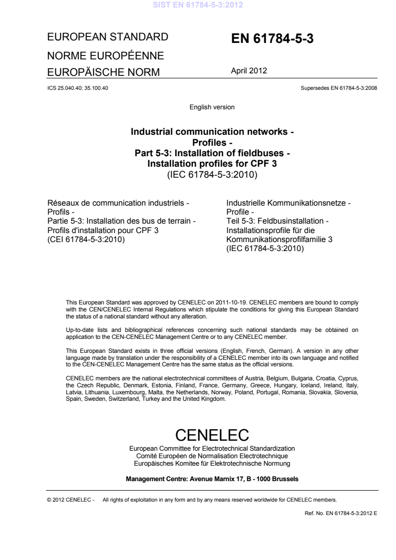 EN 61784-5-3:2012 is a standard published by CLC. Its full title is "Industrial communication networks - Profiles - Part 5-3: Installation of fieldbuses - Installation profiles for CPF 3". This standard covers: IEC 61784-5-3:2010(E) specifies the installation profiles for CPF 3 (PROFIBUS/PROFINET). The installation profiles are specified in the annexes. These annexes are read in conjunction with IEC 61918:2010. This second edition cancels and replaces the first edition published in 2007. This edition constitutes a technical revision. It includes the technical changes of the corrigendum for the first edition in 2008 and an addition concerning transmission performance measurement (see Annex C.6.3.2.1.2). This publication is to be read in conjunction with IEC 61918:2010.