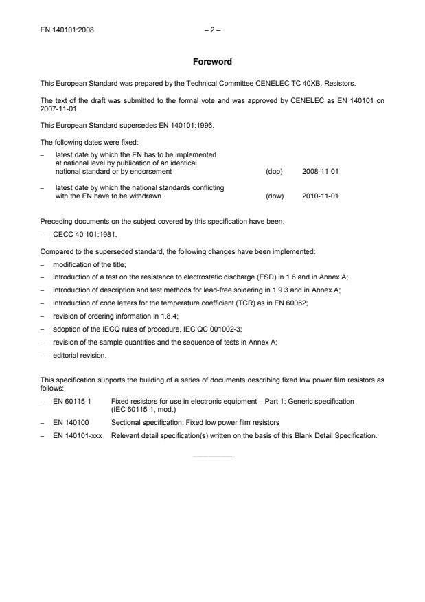 2010-11-01 Preceding documents on the subject covered by this specification have been: − CECC 40 101:1981. Compared to the superseded standard, the following changes have been implemented: − modification of the title; − introduction of a test on the resistance to electrostatic discharge (ESD) in 1.6 and in Annex A; − introduction of description and test methods for lead-free soldering in 1.9.3 and in Annex A; − introduction of code letters for the temperature coefficient (TCR) as in EN 60062; − revision of ordering information in 1.8.4; − adoption of the IECQ rules of procedure, IEC QC 001002-3; − revision of the sample quantities and the sequence of tests in Annex A; − editorial revision.