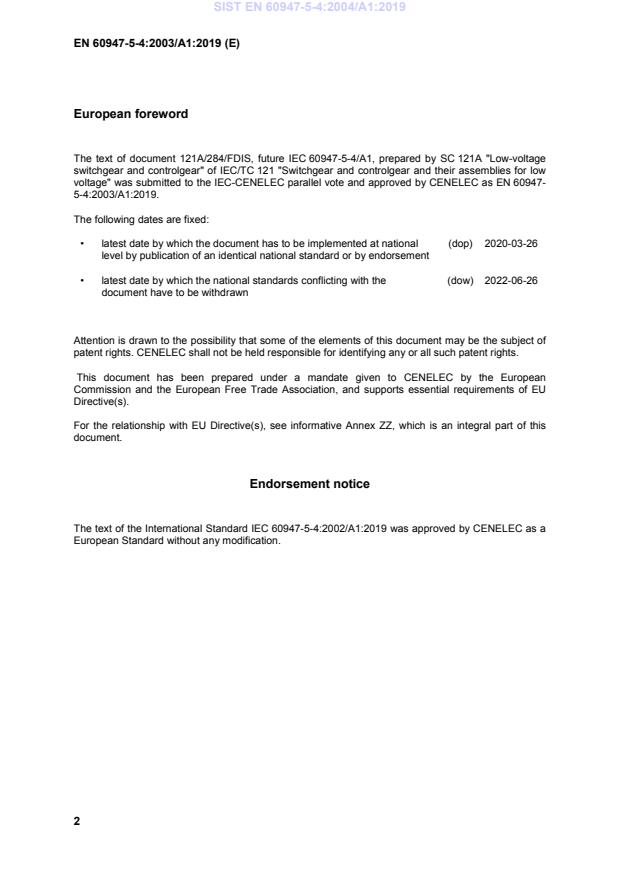 EN 60947-5-4:2003/A1:2019 is a amendment published by CLC. Its full title is "Low-voltage switchgear and controlgear - Part 5-4: Control circuit devices and switching elements - Method of assessing the performance of low-energy contacts - Special tests". This standard covers: 2019-04-16: Formal Vote assessment documents (ZA, RA) sent to Production on 2019-04-16 by the TC and revised Annex ZZ sent to Production on 2019-04-18. Consider the possibility to go to BT to validate the Annex ZZ, since not included in the Formal Vote documentation. Furthermore, Consultant suggests modifications to the foreword. Check with PM before publication. 2019-03-20: Annex ZZ not included in the FV documents. Check with PM before requesting Formal Vote assessment. 2018-12-07: positive LVD assessment at ENQ. The updated Annex ZZ which received a positive assessment has not been included in the public Enquiry. It will have to be included for FV.