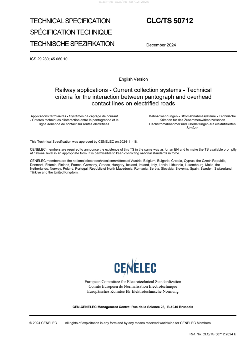 Keywords: CLC/TS 50712:2024, pantograph, overhead contact line, ERS, electric road systems, OCLS, dynamic current collection, pantograph testing, vehicle-infrastructure interface, maintenance, safety concept.