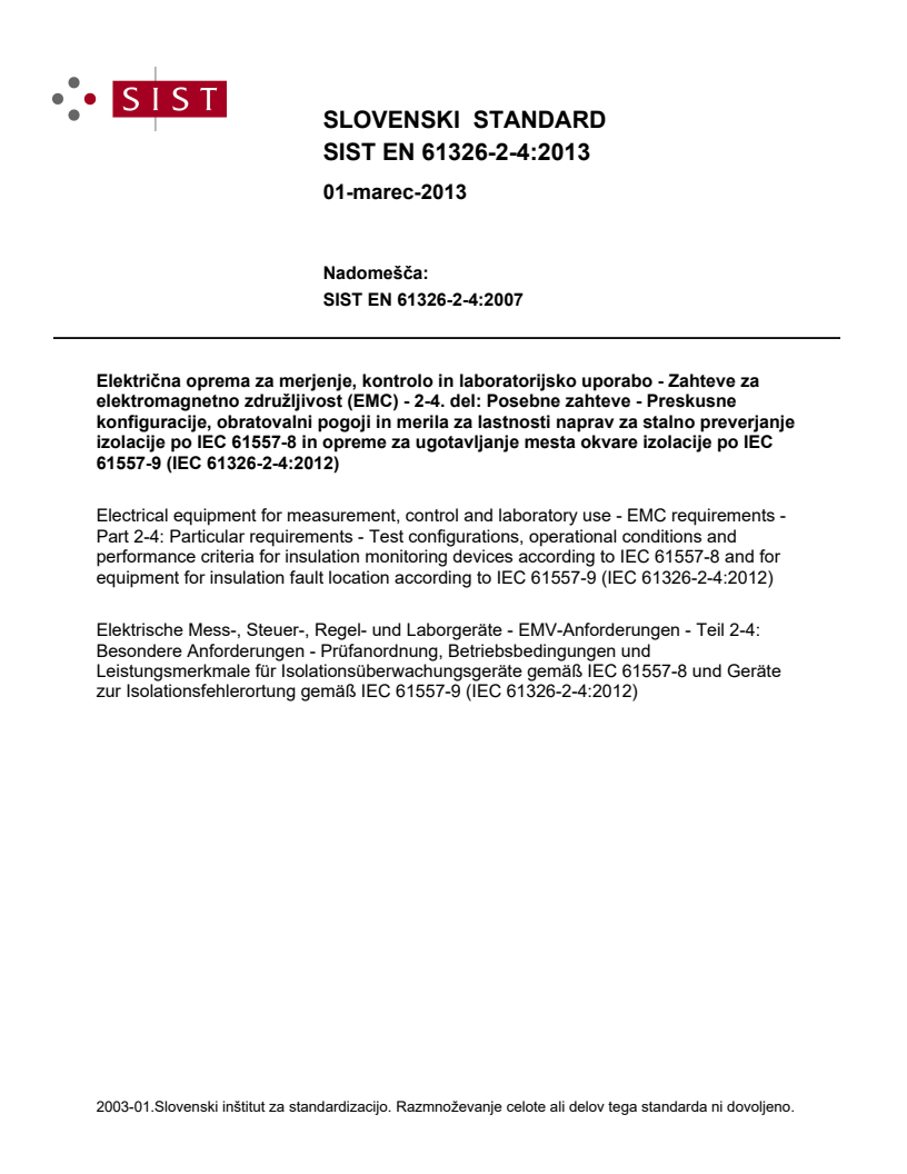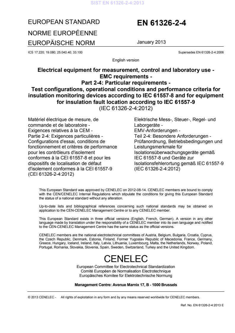 EN 61326-2-4:2013 is a standard published by CLC. Its full title is "Electrical equipment for measurement, control and laboratory use - EMC requirements - Part 2-4: Particular requirements - Test configurations, operational conditions and performance criteria for insulation monitoring devices according to IEC 61557-8 and for equipment for insulation fault location according to IEC 61557-9". This standard covers: IEC 61236-2-4:2012 specifies detailed test configurations, operational conditions and performance criteria for equipment for insulation monitoring according to IEC 61557-8 and insulation fault location according to IEC 61557-9. This applies to insulation monitoring devices and insulation fault location systems permanently or semi-permanently connected to the distribution system. This second edition cancels and replaces the first edition published in 2006 and constitutes a technical revision. It includes the following significant technical change: update of the document with respect to IEC 61326-1:2012.