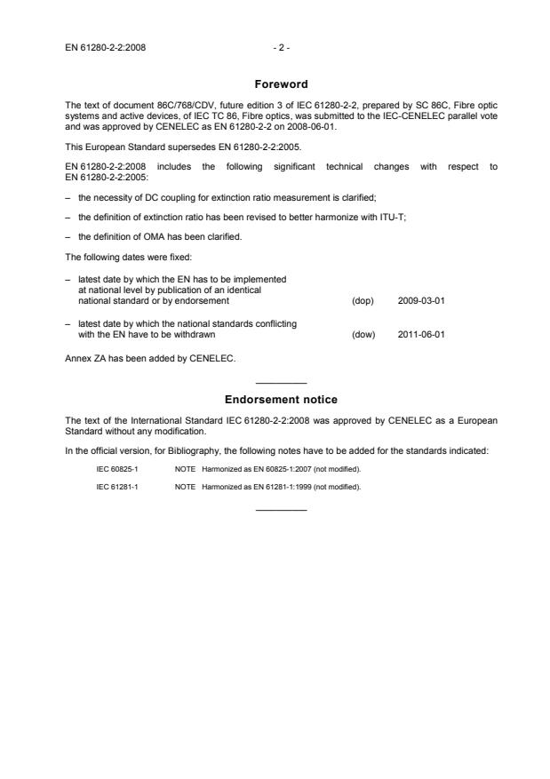 2011-06-01 Annex ZA has been added by CENELEC. __________ Endorsement notice The text of the International Standard IEC 61280-2-2:2008 was approved by CENELEC as a European Standard without any modification. In the official version, for Bibliography, the following notes have to be added for the standards indicated: IEC 60825-1 NOTE