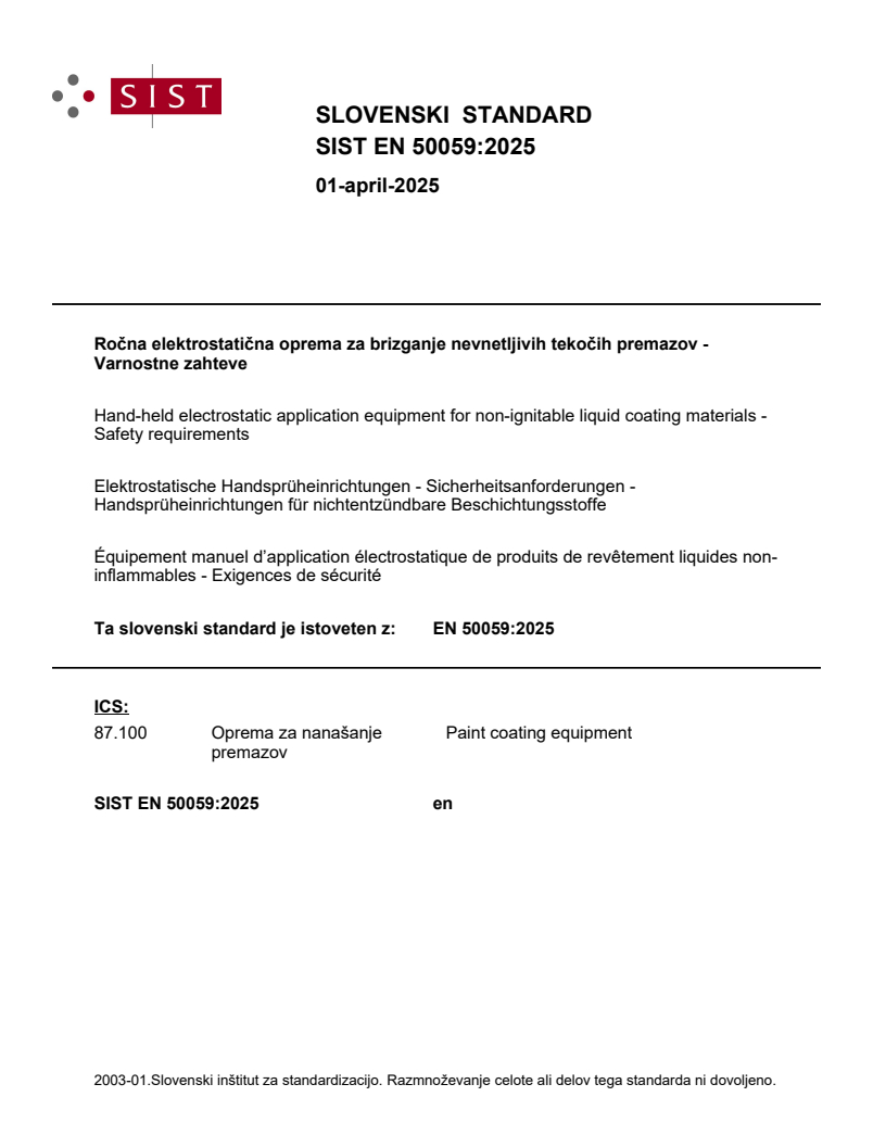 Keywords: EN 50059:2025, hand-held electrostatic application equipment, safety requirements, electrostatic spraying, coating material conductivity, bonding to earth, high-voltage hoses.