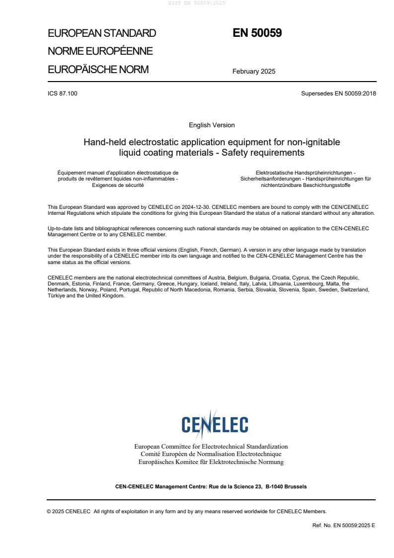 EN 50059:2025 is a standard published by CLC. Its full title is "Hand-held electrostatic application equipment for non-ignitable liquid coating materials - Safety requirements". This standard covers: 1.1 This document specifies the electrical requirements for hand-held or hand-operated electrostatic application equipment for non-ignitable liquid coating materials which — do not generate an explosive atmosphere inside the spraying area, — are used to process coating materials with a conductivity of the complete system up to 2 000 µS/cm, — operate with direct current having a d.c. sinusoidal ripple of not more than 10 % of the r.m.s. value and — are used within a temperature range from 5 °C to 40 °C. 1.2 This document specifies — requirements for an interface to machinery according to EN 16985:2018, — additional requirements for machinery according to EN 1953:— and EN 12621:— . 1.3 This document also specifies requirements for a safe operation of electrostatic application equipment, including the electrical installation. The requirements consider both the processing of coating materials and the cleaning and purge processes. 1.4 For electrostatic application equipment used in food and pharmaceutical industry, additional requirements can apply. 1.5 This document does not apply to — electrostatic hand-held spraying equipment for ignitable materials, see EN 50050:2013, Parts 1 to 3; — cleaning systems for spraying devices; — quality assurance systems for electrostatic spraying equipment (see EN ISO/IEC 80079-34:2020, Annex ZB 11).