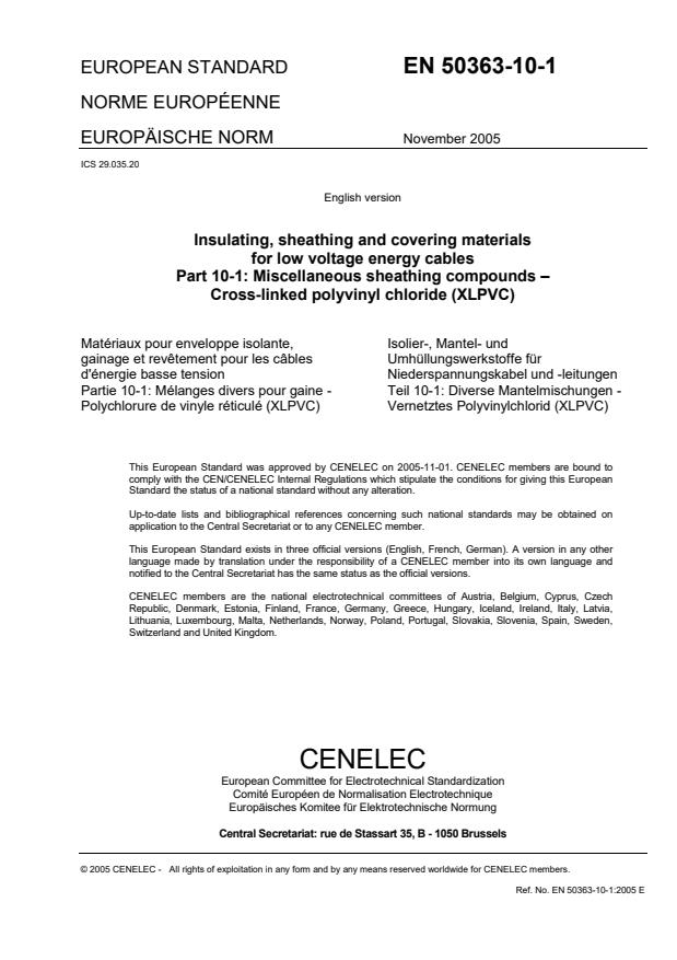 EN 50363-10-1:2005 is a standard published by CLC. Its full title is "Insulating, sheathing and covering materials for low voltage energy cables - Part 10-1: Miscellaneous sheathing compounds - Cross-linked polyvinyl chloride (XLPVC)". This standard covers: This part of EN 50363 specifies the test requirements for the physical properties of the harmonised cross-linked PVC sheathing compound given in Table 1. The relevant test methods are given in EN 60811 series.