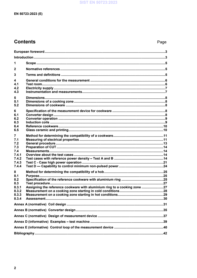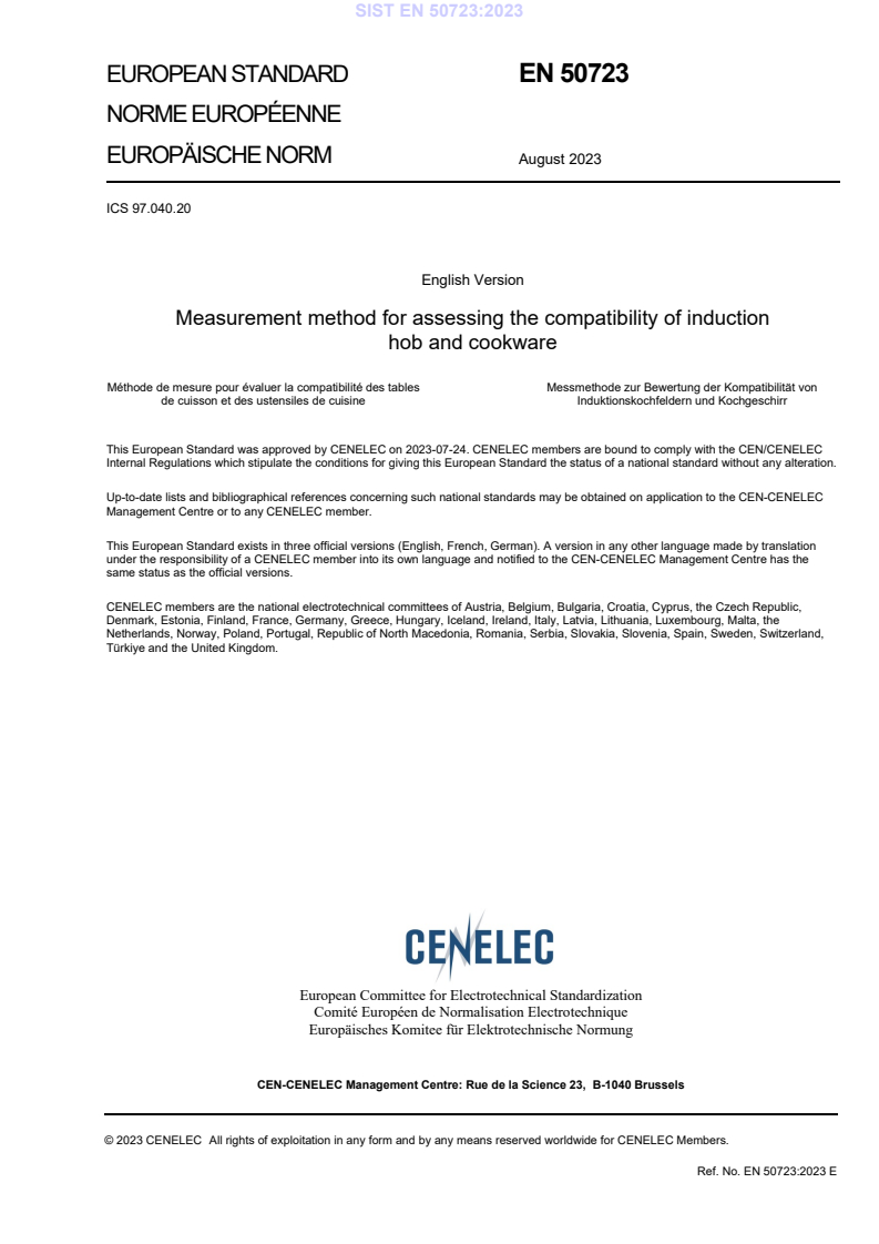 EN 50723:2023 is a standard published by CLC. Its full title is "Measurement method for assessing the compatibility of induction hob and cookware". This standard covers: This document describes a method which determines the electrical parameters for compatibility of cookware and induction hobs for household use. Cookware is an integral part of the cooking system; electrical parameters can affect the cooking process regarding the required power setting, speed of heating up, sufficient power for different cooking processes etc. For determining the compatibility of a cookware to an induction cooking zone and cooking area, a measurement device and a measurement procedure is specified in this document. It allows measuring the resistivity and/or impedance of the cookware under test (CUT) in a repeatable and reproducible way. The measured electric properties indicate the compatibility characteristics of a cookware on an induction cooking zones and cooking area. For determination the compatibility of an induction cooking zone or cooking area with a cookware, this document describes the measurement how to determine the power generated by the cooking zone under test (ZUT) in combination with the selected cookware. NOTE 1 For definitions of induction hob, induction cooking zone and cooking area EN 60350-2 is relevant. Further performance characteristics of hobs which are of interest to the user, like energy consumption, heating up time or heat distribution are not addressed. This document does not deal with safety requirements. NOTE 2 Further performance characteristics for hobs are covered in EN 60350-2. NOTE 3 Further performance characteristics for cookware are covered in EN 12983-1 and EN 12983-2. NOTE 4 Safety requirements are covered in IEC 60335-2-6 and IEC 60335-2-9. Appliances covered by this document can be built-in or portable induction hobs. The hob can also be a part of a cooking range.