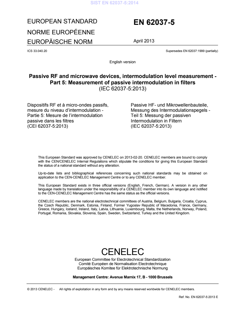 submitted to the IEC-CENELEC parallel vote and approved by CENELEC as EN 62037-5:2013.