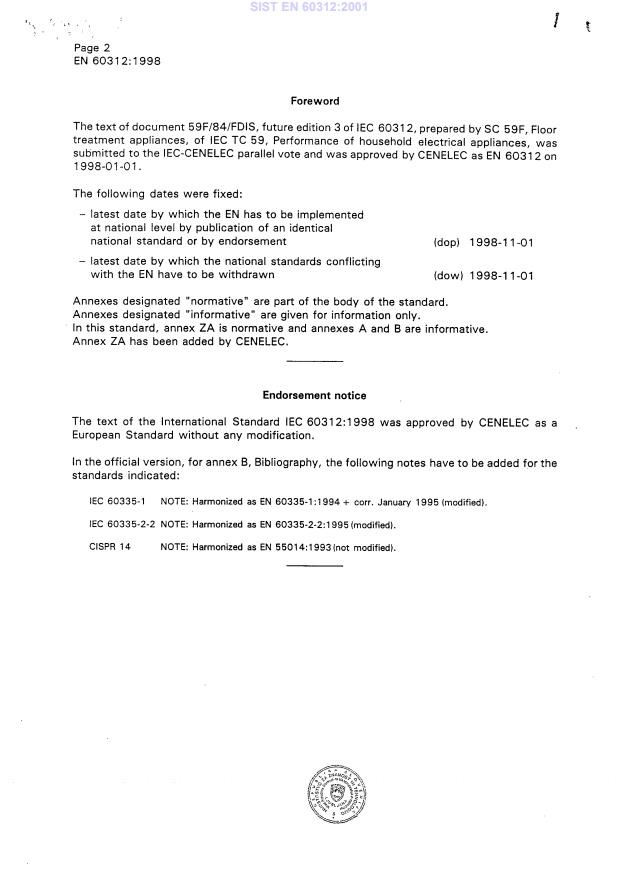 EN 60312:1998/A2:2004 - Vacuum cleaners for household use - Methods of measuring the performance - Effective Date