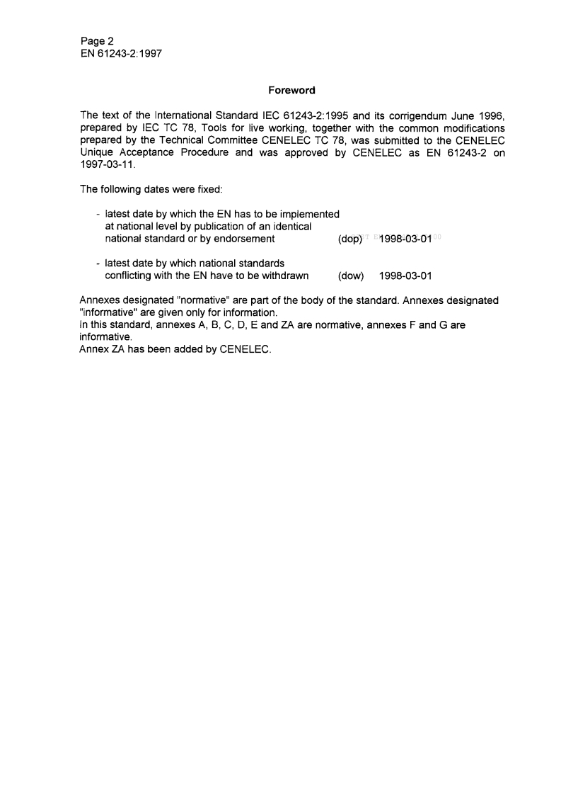 EN 61243-2:1997 is a standard published by CLC. Its full title is "Live working - Voltage detectors - Part 2: Resistive type to be used for voltages of 1 kV to 36 kV a.c.". This standard covers: Is applicable to portable voltage detectors with or without a built-in power source to be used on electrical systems for voltages of 1 kV to 36 kV a.c., and frequencies from 15 Hz to 60 Hz. This part applies only to resistive voltage detectors used in contact with the part to be tested, as a single unit or as a separate device completed by an adaptable insulating pole covered in EN 60855 or EN E1235. Other types of voltage detectors are not covered by this part of standard.Capacitive voltage detectros are covered in EN 61243-1.