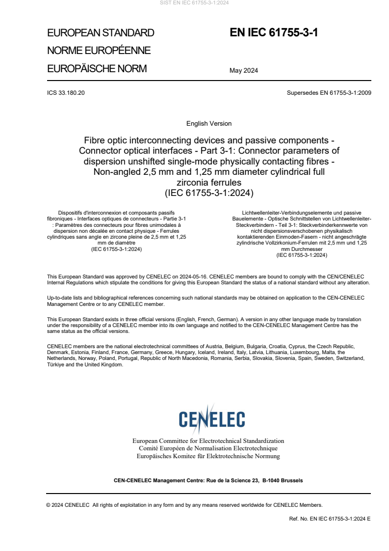 EN IEC 61755-3-1:2024 specifies the optical-interface dimensional limits for dispersion-unshifted single‑mode fibre optic connectors using non‑angled full zirconia (ZrO2) ferrules of 2.5 mm and 1.25 mm diameter. This second edition (replacing the 2006 edition) defines connector parameters required to achieve reliable fibre‑to‑fibre interconnection and ensures ferrules made from the specified zirconia material are suitable for the operating service environments in IEC 61753‑1.