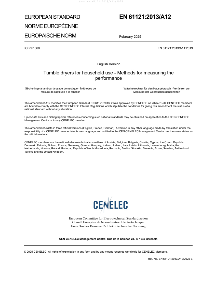 Keywords: EN 61121:2013/A12:2025, tumble dryers, performance testing, energy efficiency, eco programme, condensation efficiency, multi-drum tumble dryer, low power modes, energy labelling, ecodesign.