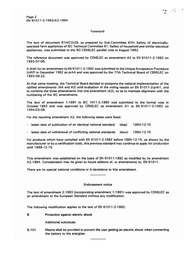 EN 61011-1:1992/A2:1994 is a amendment published by CLC. Its full title is "Electric fence energizers - Safety requirements for battery-operated electric fence energizers suitable for connection to the supply mains". This standard covers: EN following parallel vote * Superseded by EN 60335-2-76:1999