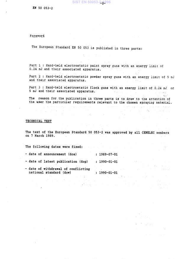 EN 50053-2:1989 is a standard published by CLC. Its full title is "Requirements for the selection, installation and use of electrostatic spraying equipment for flammable materials - Part 2: Hand-held electrostatic powder spray guns with an energy limit of 5 mJ and their associated apparatus". This standard covers: This European Standard gives requirements for the selection, installation and safe use of hand-held electrostatic spray guns with an energy limit of 5 mJ and their associated apparatus complying with EN 50 050, which may cause an explosive atmosphere when spraying flammable coating powders. This European Standard considers only the hazards that are specific to the electrostatic characteristics of the electrostatic spraying process when the operator stands outside the booth when spraying. For other aspects such as classification of hazardous areas (e.g. classification into zones), selection, installation and use of electrical equipment in hazardous areas, health hazards (e.g. toxic and skin effects, electric shock), cleaning of powder spraying areas, fire hazard from external sources, storage and handling of flammable materials, explosion protection systems, national regulations apply