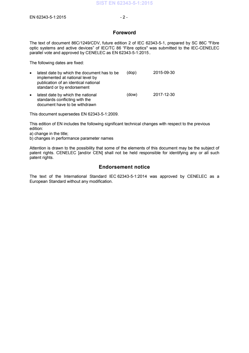 Attention is drawn to the possibility that some of the elements of this document may be the subject of patent rights. CENELEC [and/or CEN] shall not be held responsible for identifying any or all such patent rights. Endorsement notice The text of the International Standard IEC 62343-5-1:2014 was approved by CENELEC as a European Standard without any modification. SIST EN 62343-5-1:2015