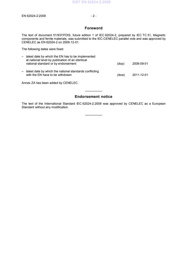 Foreword The text of document 51/937/FDIS, future edition 1 of IEC 62024-2, prepared by IEC TC 51, Magnetic components and ferrite materials, was submitted to the IEC-CENELEC parallel vote and was approved by CENELEC as EN 62024-2 on 2008-12-01. The following dates were fixed: – latest date by which the EN has to be implemented