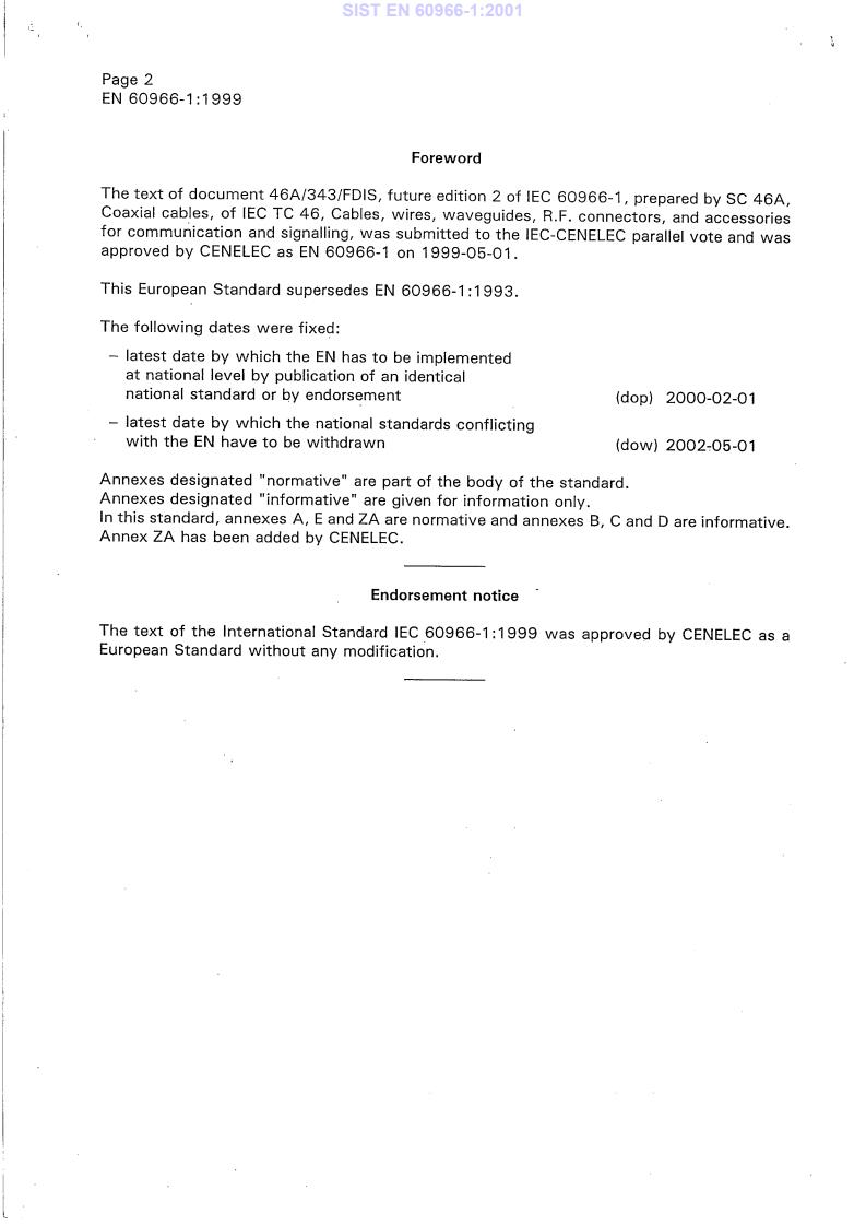 Attention is drawn to the possibility that some of the elements of this International Standard may be the subjectof patent rights. The IEC shall not be held responsible for identifying any or all such patent rights.International Standard IEC 60966-1 has been prepared by subcommittee 46A: Coaxial cables,of IEC technical committee 46: Cables, wires, waveguides, r.f. connectors and accessories forcommunication and signalling.This second edition cancels and replaces the first edition published in 1988, amendment 1(1990) and amendment 2 (1995) and constitutes a technical revision.The text of this standard is based on the following documents:FDISReport on voting46A/343/FDIS46A/346/RVDFull information on the voting for the approval of this standard can be found in the report onvoting indicated in the above table.Annexes A and E form an integral part of this standard.Annexes B, C and D are for information only.SIST EN 60966-1:2001