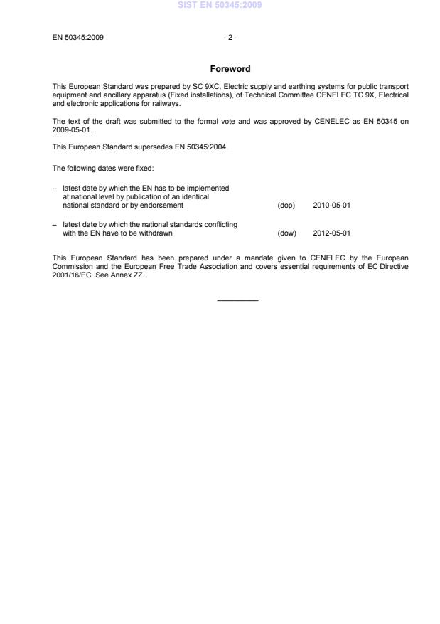 EN 50345:2009 - Railway applications - Fixed installations - Electric traction - Insulating synthetic rope assemblies for support of overhead contact lines is a CENELEC European Standard that defines the product characteristics, test methods, inspection procedures and ordering/delivery requirements for insulating synthetic ropes used in electric traction overhead contact lines. The standard applies to railways, light rail, tramways, trolleybuses and similar systems and covers design provisions to ensure mechanical support and electrical insulation of overhead contact wires.