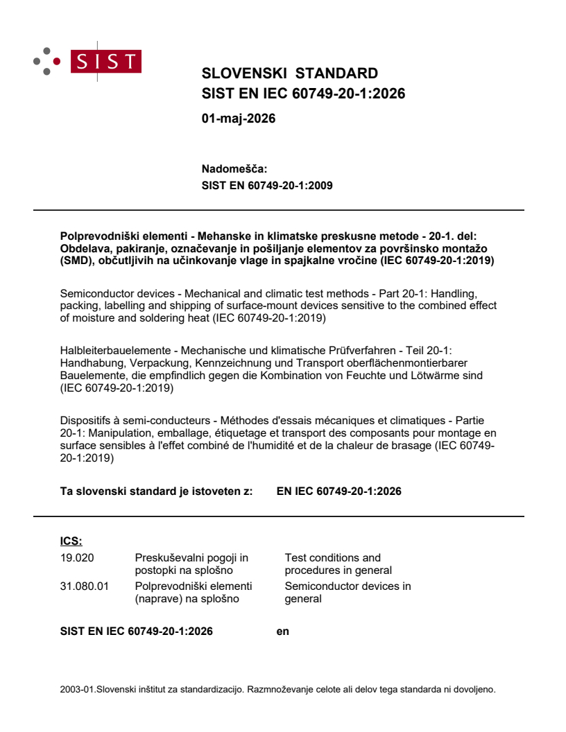 Ta slovenski standard je istoveten z: EN IEC 60749-20-1:2026