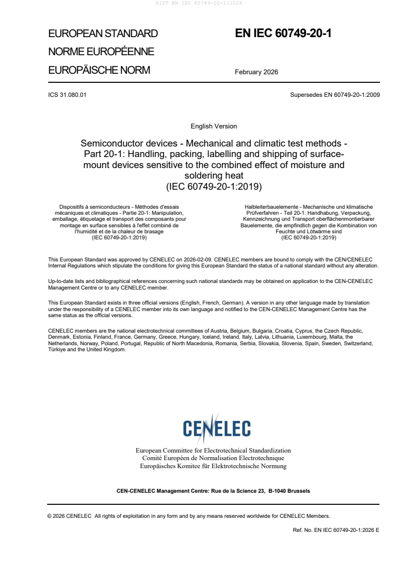 EN IEC 60749-20-1:2026 establishes standardized methods for the handling, packing, labelling, and shipping of surface-mount devices (SMDs) sensitive to the combined effects of moisture and soldering heat. Developed by CLC and harmonized with IEC 60749-20-1:2019, the standard is designed to minimize yield loss and ensure the long-term reliability of plastic-encapsulated and other moisture-sensitive semiconductor packages during printed circuit board assembly. The procedures outlined help manufacturers and end-users avoid damage arising from moisture uptake and subsequent exposure to reflow soldering, addressing all SMDs made with moisture-permeable materials such as epoxies and silicones.