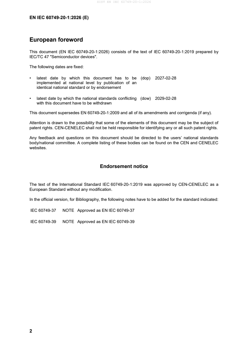EN IEC 60749-20-1:2026 is a standard published by CLC. Its full title is "Semiconductor devices - Mechanical and climatic test methods - Part 20-1: Handling, packing, labelling and shipping of surface-mount devices sensitive to the combined effect of moisture and soldering heat". This standard covers: IEC 60749-20-1:2019 applies to all devices subjected to bulk solder reflow processes during PCB assembly, including plastic encapsulated packages, process sensitive devices, and other moisture-sensitive devices made with moisture-permeable materials (epoxies, silicones, etc.) that are exposed to the ambient air. The purpose of this document is to provide SMD manufacturers and users with standardized methods for handling, packing, shipping, and use of moisture/reflow sensitive SMDs that have been classified to the levels defined in IEC 60749-20. These methods are provided to avoid damage from moisture absorption and exposure to solder reflow temperatures that can result in yield and reliability degradation. By using these procedures, safe and damage-free reflow can be achieved, with the dry packing process, providing a minimum shelf life capability in sealed dry-bags from the seal date. This edition includes the following significant technical changes with respect to the previous edition: - updates to subclauses to better align the test method with IPC/JEDEC J-STD-033C, including new sections on aqueous cleaning and dry pack precautions; - addition of two annexes on colorimetric testing of HIC (humidity indicator card) and derivation of bake tables.