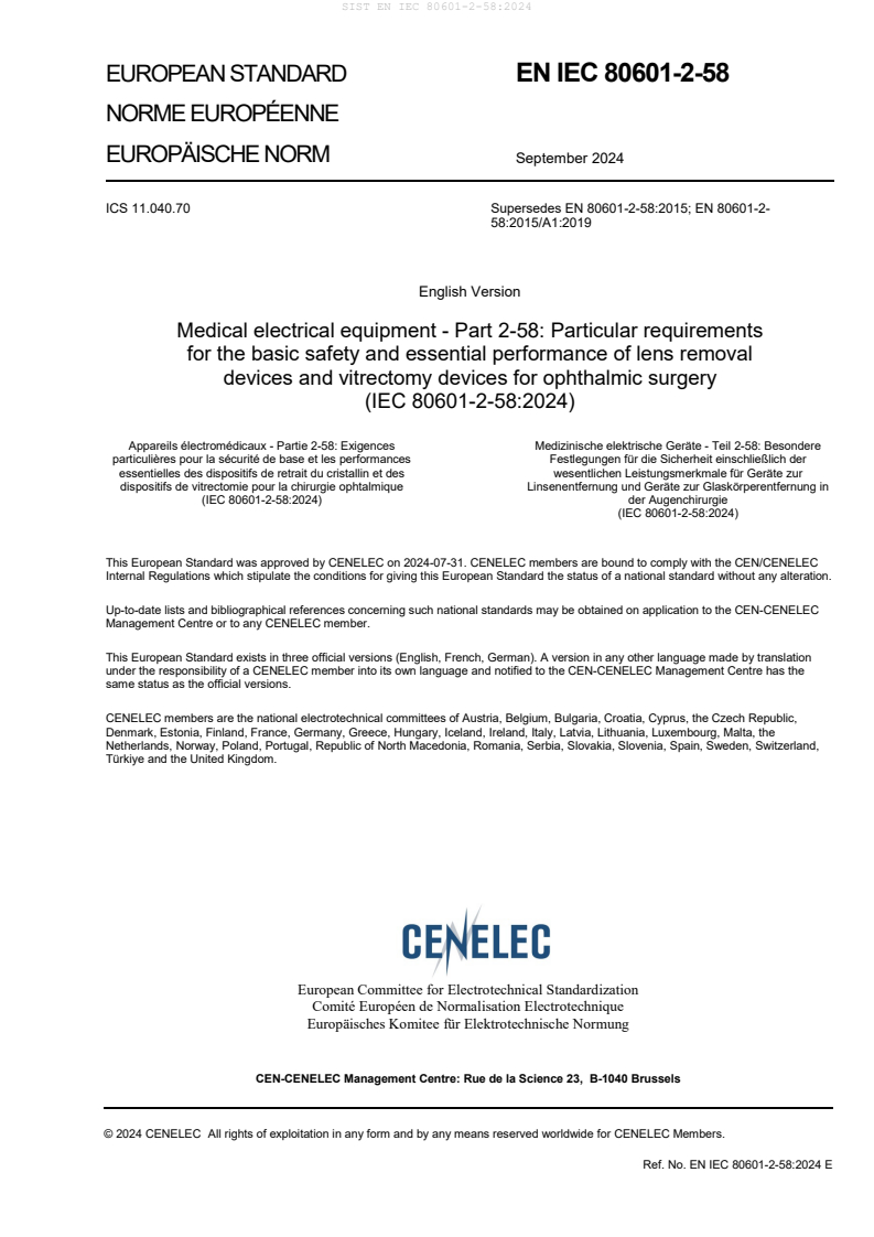 EN IEC 80601-2-58:2024 - Medical electrical equipment - Part 2-58 - specifies the basic safety and essential performance requirements for lens removal devices and vitrectomy devices used in ophthalmic surgery, and for associated accessories that connect to this medical electrical equipment (ME EQUIPMENT / ME SYSTEMS). This third edition (2024) cancels and replaces the 2014 edition and Amendment 1:2016 and is issued as an IEC international standard with a redline (RLV) showing technical changes versus the previous edition.