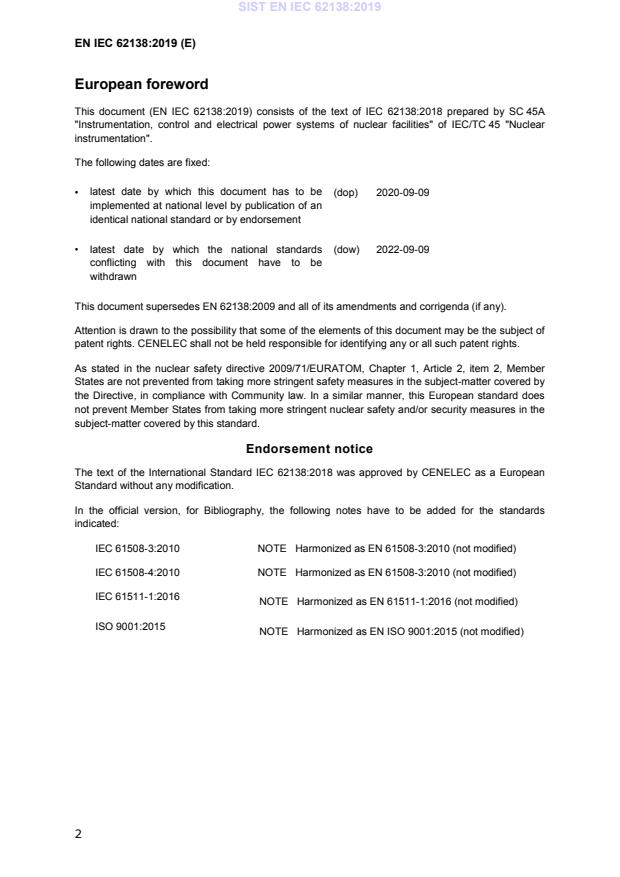 EN IEC 62138:2019 is a standard published by CLC. Its full title is "Nuclear power plants - Instrumentation and control systems important to safety - Software aspects for computer-based systems performing category B or C functions". This standard covers: This document specifies requirements for the software of computer-based instrumentation and control (I&C) systems performing functions of safety category B or C as defined by IEC 61226. It complements IEC 60880 which provides requirements for the software of computer-based I&C systems performing functions of safety category A. It is consistent with, and complementary to, IEC 61513. Activities that are mainly system level activities (for example, integration, validation and installation) are not addressed exhaustively by this document: requirements that are not specific to software are deferred to IEC 61513. The link between functions categories and system classes is given in IEC 61513. Since a given safety-classified I&C system may perform functions of different safety categories and even non safety-classified functions, the requirements of this document are attached to the safety class of the I&C system (class 2 or class 3). This document is not intended to be used as a general-purpose software engineering guide. It applies to the software of I&C systems of safety classes 2 or 3 for new nuclear power plants as well as to I&C upgrading or back-fitting of existing plants. For existing plants, only a subset of requirements is applicable and this subset has to be identified at the beginning of any project. The purpose of the guidance provided by this document is to reduce, as far as possible, the potential for latent software faults to cause system failures, either due to single software failures or multiple software failures (i.e. Common Cause Failures due to software). This document does not explicitly address how to protect software against those threats arising from malicious attacks, i.e. cybersecurity, for computer-based systems. IEC 62645 provides requirements for security programmes for computer-based systems.