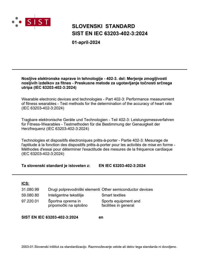 Standard IEC 63203-402-3:2024 določa pogoje, protokol merjenja in preskus za ocenjevanje točnosti nosljivih naprav, ki merijo srčni utrip s fotopletizmografskim senzorjem (PPG). Čeprav je mogoče ta dokument uporabljati za merjenje različnih naprav, ki naj bi prikazovale srčni utrip, je potrebna pozornost pri preskušanju v državah, ki razlikujejo med srčnim utripom in pulzom. Ta protokol za merjenje je namenjen za ocenjevanje medicinskih pripomočkov, povezanih s skupino standardov IEC 60601 ali skupino standardov ISO 80601.