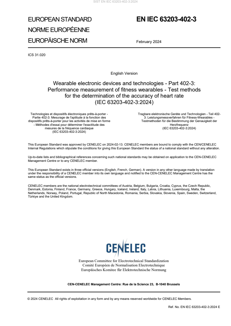 EN IEC 63203-402-3:2024 is a standard published by CLC. Its full title is "Wearable electronic devices and technologies - Part 402-3: Performance measurement of fitness wearables - Test methods for the determination of the accuracy of heart rate". This standard covers: IEC 63203-402-3:2024 specifies terms, a measurement protocol, and a test to evaluate the accuracy of wearables that measure heart rate with a photoplethysmography (PPG) sensor. While this document can be used to measure a variety of different devices claiming to report heart rate, care will be taken when testing in countries that differentiate between heart rate and pulse rate. This measurement protocol is not intended to evaluate medical devices associated with the IEC 60601 series or ISO 80601 series.