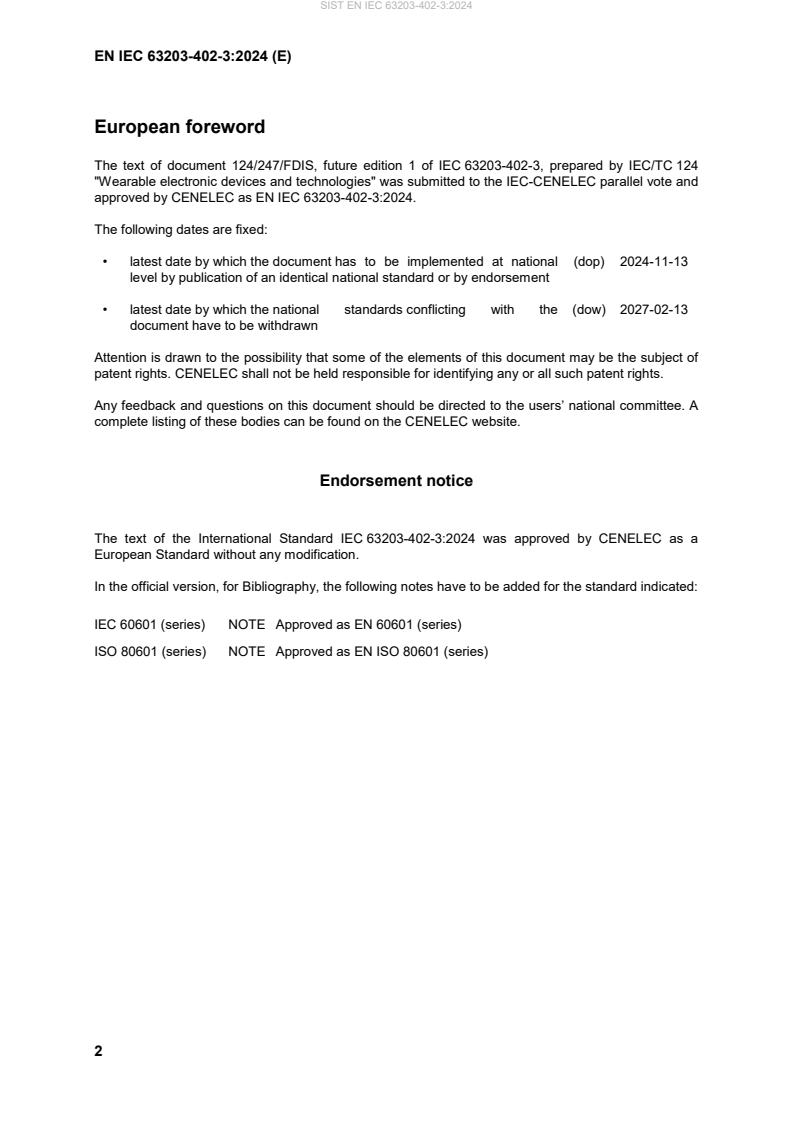 - IEC 60601 (series) and ISO 80601 (series) - referenced for medical device context; EN IEC 63203-402-3:2024 is explicitly not intended to evaluate devices covered by these medical-device standards.