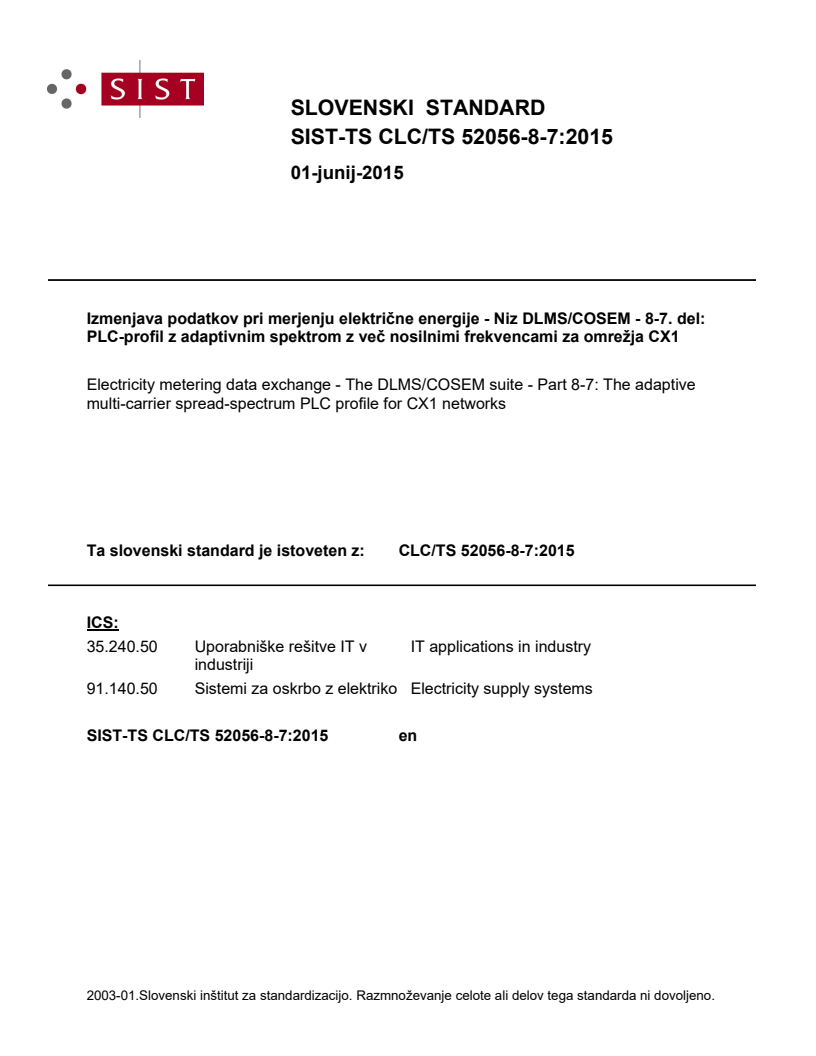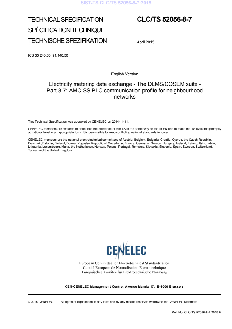 Keywords: DLMS/COSEM, AMC‑SS, PLC, power line communication, neighbourhood networks, CLC/TS 52056-8-7:2015, smart meters, AMI, CENELEC.